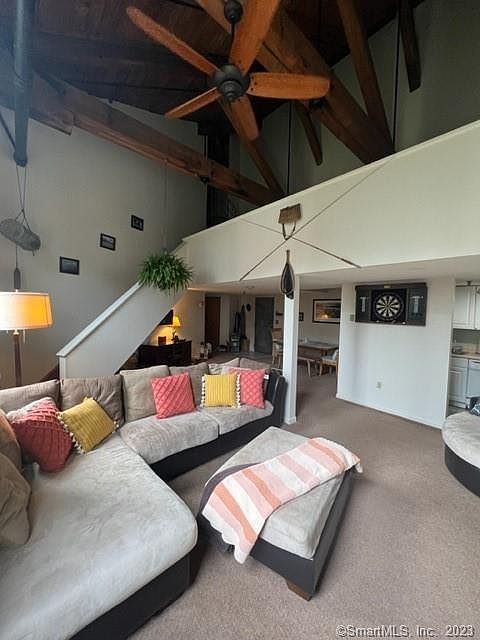 Falls Mills condos are located on the beautiful Yantic River just below the Indian Leap Falls in Norwich. Originally built as a textile mill in the 1800's, this historic building was converted to residences in the 1980"s. This is one of the larger units in the complex and features soaring ceilings, exposed brick and beautiful chestnut beams. The main level features an open floor plan with a large living room area and huge windows. The guest bed is just off the dining and living room area along side one of the two full bathrooms. The primary bedroom has its own remodeled bathroom with a beautiful custom tile shower, a large walk in closet, and vaulted ceilings. There are laundry hookups in the unit and the washer/dryer are included in the sale. This is a very unique unit that deserves a closer look. Selling as-is