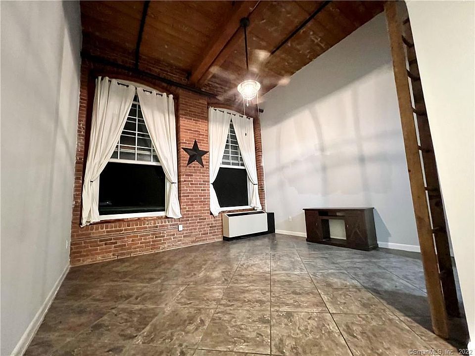 Situated at the end of a cul-de-sac, on waterfront property are the Falls Mill Condominiums. This is your chance to own one of these unique and sought-after units! The combination living/dining room boasts two-story windows flanked by an exposed brick wall that draws the eye up to the vaulted ceiling supported by gorgeous wood beams. A spiral staircase not only complements the industrial style of this condo, it also leads to the lofted bedroom with a walk-in closet. Please note that the loft has a low ceiling height, it is approximately 6', the ceiling is not vaulted in this portion of the unit. The property also includes a seasonal indoor pool, tennis court, and access to the Yantic River.