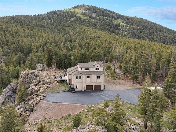 **Seller offering a $10K credit towards closing costs/buy down!**  FALL IN LOVE with this 2.5 Acre, MOUNTAIN RETREAT with SPECTACULAR VIEWS! This property has an open concept floorplan which is great for entertaining and features heated concrete kitchen floors, granite countertops, custom Alder solid wood soft close cabinets, modern pantry and stainless-steel appliances (INCLUDED). Two additional bedrooms and renovated full bath on same level as the eat-in-kitchen. The primary bedroom features its own level with a luxurious 5-piece bath, jetted tub, double sided gas fireplace, walk-in closet, barn door and Juliette balcony. The basement comprises an office, laundry room (W/D INCLUDED), bedroom (non-conforming), and renovated full bath. The house has baseboard hot water heating with 2 tankless on-demand water heaters. The exterior is equally impressive with Trex Decking and a concrete patio both with iron railing, custom post and wire fire-pit and fenced-in dog run not to mention fire mitigation! This property has a south-facing driveway and parking pad. The property backs up to 470 acres of natural preserve and boasts unparalleled views of Denver’s city night lights and open space! Situated on the mountainside, this hideaway is only 3 miles off I-70, 20-25 minutes to Denver, Blackhawk/Central City, and approx. 40 Min. to Ski Slopes! The house is equipped with several modern upgrades such as a whole-house Springwell Water Filtration System, reverse osmosis at the kitchen sink, wood flooring and new rustic gas fireplace facade and hearth in the living room, a newer septic system, RV parking and additional parking for several additional vehicles. Custom Andersen Windows with custom blinds on every window! The garage is heated with a hot dawg heater.