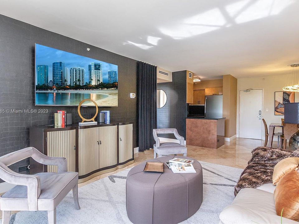 Rare opportunity to enjoy a turn-key, fully-furnished, one bedroom, one bath condo in a premier line that rarely comes on the market. Exquisitely renovated by an international, published designer. Marble floors throughout. Living room with reclining sofa, 75” TV, exotic dining table and chairs from Bali. Bedroom has hotel-quality bed, luxurious custom headboard, 55” TV and walk-in closet. Fabulous sunsets from the balcony. Resort-like facilities like no other condo includes two restaurants, two pools, hot tub, fitness center with classes and trainers. Pets are welcome with great facilities including Doggie VIP. Ability to produce income with convenient monthly rentals. Fabulous location two blocks from Lincoln Road. Equal Housing Opportunity