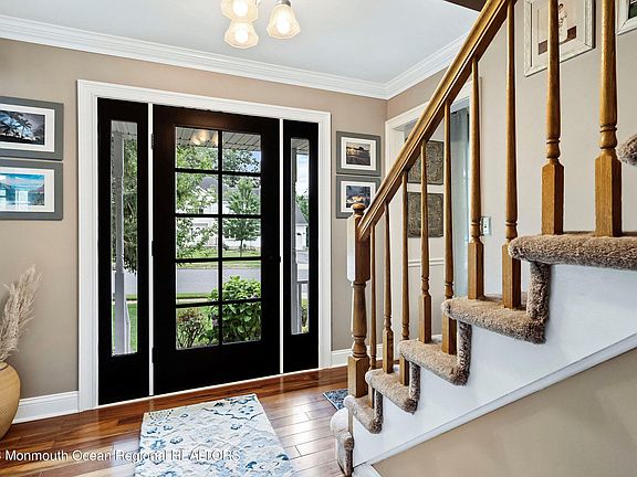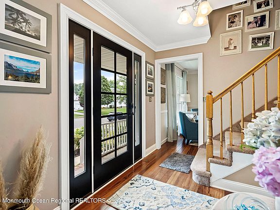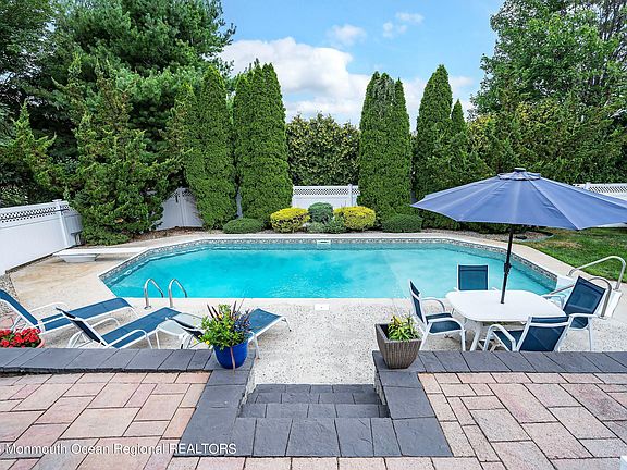 Beautiful 4 BR/2.5BA colonial in a fabulous Wall township neighborhood, 2 miles to the beach. Back yard Oasis with large salt water pool, connection for outdoor TV, lighting and paver patio with multiple levels. Open floor plan on first floor offers den/office, large DR and family room w/fireplace. Eat in kitchen has island, granite counters, wine fridge. Custom French Doors lead to the Sun Room w/ gas fireplace overlooking the yard and pool. Convenient laundry room on first floor plus half bath with easy pool access. Hardwood floors round out the first floor. Finished basement boasts a built in wet bar, separate room for crafts/office plus storage area. 4 BR's on second floor. Large Primary w/walk in closet, en suite bathroom, 3 additional BR's with full bath in hallway. Custom built by sellers, well built with many behind the scenes upgrades , such as copper L gauge piping.