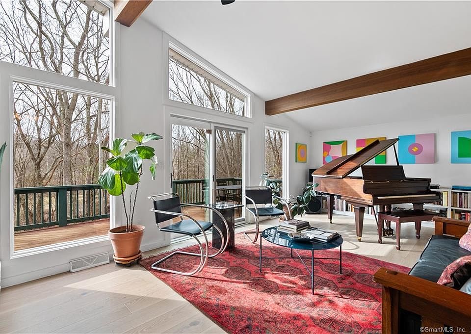 Rare opportunity to purchase a mid century modern that has been beautifully remodeled throughout. The home features a stylish living room with cathedral ceilings, exposed wood beams, white washed brick wood burning fireplace, custom built ins & an incredible wall of windows with striking views of the grounds. A glass sliding door provides access to the deck - perfect for entertaining & enjoying the sounds of nature. Tastefully remodeled kitchen with Corian counters, SS appliances, large center island, breakfast bar, tile backsplash & modern lighting. A cozy dining space is located just off of the kitchen. The spacious primary bedroom suite has great natural light, refinished HW floors, a large closet & an updated bath. Two additional bedrooms and a second remodeled bath with a double vanity complete the floor. The lower level has been beautifully remodeled & is a perfect flex space for modern day living. The room currently has multiple uses as family room, gym, laundry room & mud room & provides access to the 1 car garage. Huge bonus: a detached office/art studio that includes a 1/2 bath-excellent for anyone working from home. The house is a natures lovers dream on 2.40 wooded acres with a gorgeous river running through the property (stocked with trout) & surrounded on two sides by 136-acre Bittner Park with hiking trails, playground, pickle ball courts & more! Conveniently located a short drive from town center, highways & a 20 minute drive to Downtown New Haven & Yale!