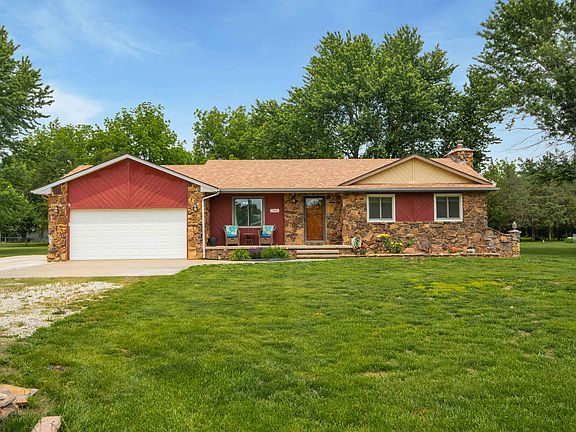 Move-in ready rustic home in Haysville! This 4 bed, 4 bath, ranch-style bungalow sits on 0.93 acres with plenty of parking and storage! Simple and convenient home living just a few minutes drive from everywhere you need to be. This is a well-kept house with decent interior spaces and a fully finished basement with bonus living quarters for a large family. Rustic stone decor, matching red wood siding, and a cozy sitting area at the front porch all beckon you into its warm and welcoming living room with cathedral ceiling. It’s all white with natural wood-stained trim inside, so the home looks bright and airy. A dining area has sliding door access to the rear patio and is right by the parallel kitchen with formica counters, tile backsplash, and hardwood base and overhead kitchen cabinets. Three bedrooms at the main level have access to a full hall bath; one has been converted into a home office. Come downstairs and there are more bonus rooms you can convert into sleeping quarters, with easy access to more baths. The family room downstairs features a brick wood fireplace/stove, a corner dedicated to home gym equipment, and an unfinished section for your utilities and basement storage. Outside, two spacious storage sheds, one with attic space, can be converted into a man cave or workshop. A prefab carport easily fits four vehicles, on top of the 2-car attached garage of the residence. An O-driveway in the backyard gives easy access to the outbuildings and to any future improvements the new owners will decide to build on the spacious residential lot. This property also includes a backup power generator that will keep electricity and water pumps running! If a simple home with spacious interiors and a large lot is what you’re looking for, then look no further! Call us today to schedule an appointment and see this listing.