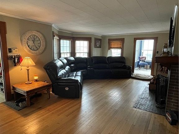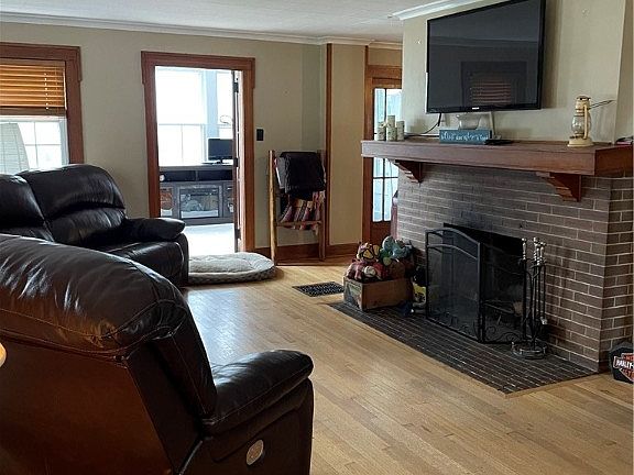 bedrooms with large closets and a full bath. The main level includes a large living room, with a cozy fireplace and a sunroom. The