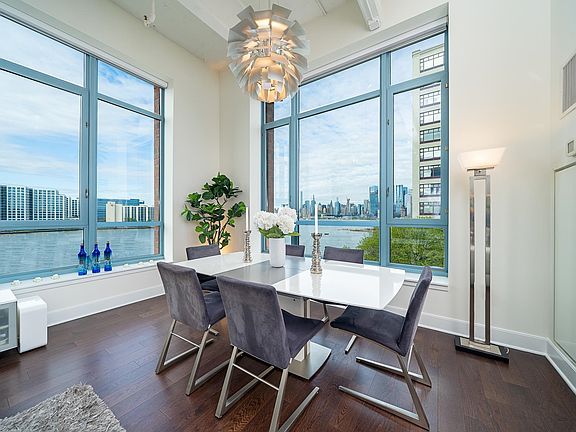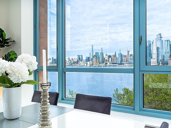 Spectacular northeast corner condo at Harborside Lofts. Suspended over the Hudson like the prow of a yacht, Residence 4F at Harborside Lofts offers a truly unique perspective; providing homeowners the sensation of floating on the river with the Manhattan skyline as backdrop. Every window showcases the stunning views at eye level including the latest jewel in the newly defined skyline, Hudson Yards. With 1842 sq.ft., 2 bedrooms, 2.5 baths, large den, 13’ concrete beamed ceilings & covered garage parking, this home has it all! Gourmet kitchen w/ 6 burner Viking stove, large island & pantry - Primary suite with massive walk-in-closet, luxurious marble bath w/ double vanity & oversized shower - Copious dedicated closets throughout, all customized - Laundry - CAC - Hardwood floors. Large common roof deck with outdoor kitchens, tables, lounge chairs, endless city views & landscaping, 24 hour concierge, shuttle to the PATH, 5 star community amenities shared with 1450 Washington & 1400 Hudson St. inc: 3 gyms, children's playrooms, residence lounges, rooftop pool & billiard/game room. Make your commute a delightful ride on the water to NYC with the ferry only 3 blocks away or catch the bus just 1 block away to Port Authority. Maintenance fee includes gas, hot water and all common amenities. Loft living at its finest. Parking maintenance is an additional $95.00 per month.