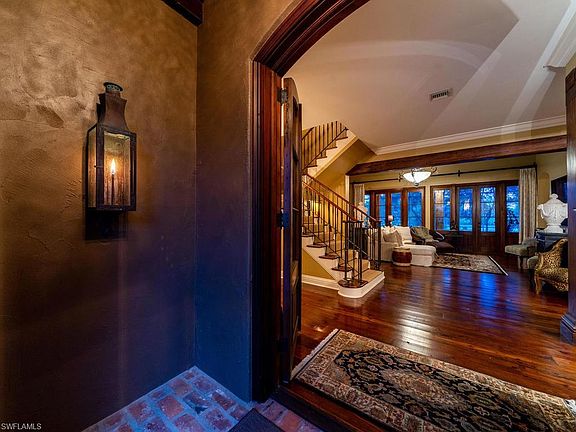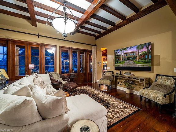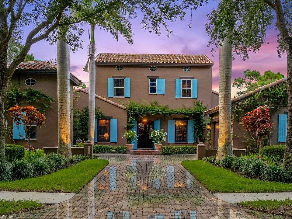 H.13772-Tons of new updates! New roof, freshly painted, newer HVAC's, new front windows! A truly unique French inspired 2-story home on a tree-lined cul-de-sac street on a golf course lot is as comfortable as it is architecturally charming. Provencal style blue shutters & bougainvillea trellises invite you to stroll the open patios winding around the exterior of the home. Separate a/c 2-car garage w/covered path to main house passing laundry room, 1st floor guest bedroom, powder bath, coffee/wine bar to Chef's kitchen w/antique cabinetry, custom appliances, granite, breakfast room. French old-world craftsmanship w/modern technologies. Wood & brick floors, intricate millwork adorns the study, kitchen, living & dining spaces. Romantic Owners Suite w/wood floors, French Doors, jetted tub designed for candle-lit evenings. Luxury & privacy for overnight guests, 1st floor guest bedroom w/lanai access, 2nd floor guest bedroom w/sitting room/4th bedroom. Screened lanai w/brick pavers, lap pool, sitting area w/fireplace, built-in grill overlooking golf course & lake. Entertain wine enthusiasts with golf cart garage converted to wine cellar! This home will mesmerize you & capture your heart!