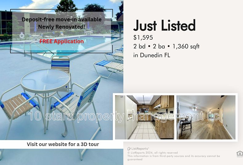 ** New listing with 10 Stars Property Management ** Beautiful 2 beds 2 baths is available for rent in Dunedin, FL. This property is located in the heart of Dunedin, a charming coastal town in Pinellas County, Florida. From here, you're just a short walk from the scenic Riverwalk, a 5-mile paved path that follows the waters of St. Joseph Sound and offers stunning views of the Gulf of Mexico. The nearby Hammock Park and Edward White Park offer additional outdoor recreation opportunities, with their playgrounds, picnic areas, and walking trails. Beachgoers can easily access Honeymoon Island State Park, with its pristine shores and abundant wildlife viewing opportunities, or head to Clearwater Beach, a popular spot for swimming, sunbathing, and water sports. For shopping and dining options, downtown Dunedin is just a few blocks away, featuring unique boutiques, restaurants, and bars along Main Street. The nearby roads include Main Street, San Mateo Drive, and State Road 580, providing easy access to nearby cities like Clearwater and St. Petersburg. Overall, this location offers a mix of natural beauty, outdoor recreation, and small-town charm. 3D Tour Available: FREE APPLICATION Features: - Application fee will be credited back on the 1st month of rent if approved - Relax in your golden years! 55+ community and any other applicant must be 18+, ensuring a mature and vibrant community - A mix of warm wood floors and stylish tiles - Basic kitchen appliances to get the job done, and a dishwasher that does all the dirty work for you - A small kitchen bar counter for an ultimate entertaining hub - Ceiling fans that keep the air circulating and the mood light - A big covered patio that's the perfect spot to relax - A spacious walk-in closets - Basic cable, internet, water, sewer, and trash are included - Power is tenant's responsibility - Laundry hookups available - One covered parking spot is provided and only 1 car allowed per unit - Access to community pool, clubhouse, and shuffleboard - $100 HOA application fee required No pets allowed. Does not apply to medically/emotional support prescribed and/or service animals. At 10 Stars, we offer multiple services to make your stay with us easy and comfortable. We have a same-day application approval and a quick move-in for no additional cost. Our team is professionally trained and will be able to assist with any leasing, billing, or maintenance issues our tenants have. We also offer an emergency line available 24/7 for any urgent cases. Tenants have access to an online portal where they can make rent payments, communicate with our team and get updates on their payments and maintenance requests at all times. THE FIRST MONTH AND SECURITY DEPOSIT ARE REQUIRED We do offer a DEPOSIT FREE MOVE IN option and a TENANT BENEFIT PACKAGE that includes: rebuilding your credit feature, cash back rewards, online portal access and free concierge service! Renter's insurance is required prior to moving in. Rules and Regulations are on our website! Only $65 non-refundable application fee per adult with 10 stars property management