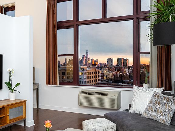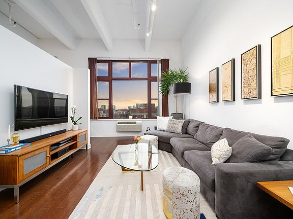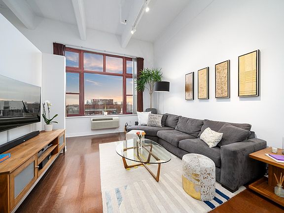 With breathtaking sunrise & Downtown Manhattan views over the Freedom Tower and sunsets to the west, this South Facing Loft, proudly perched upon the 10th floor of the iconic Hudson Tea Building, on Uptown Hoboken's Hudson River Waterfront is sure to wow you! From the moment you walk in, you're greeted with its soaring 14 foot ceilings with exposed raw concrete beams, massive 10 foot picture windows, allowing for all day natural sunlight and warmth, and a layout that lends to the most incredible utilization of space. The private sleeping alcove is tucked behind the extended custom partition wall and spacious enough for a king size bed with plenty of overhead storage and a double closet. This chic residence includes a stylish kitchen perfect for entertaining with stainless steel appliances including new slide in range, 42" all white shaker style cabinetry & countertops, extra storage shelves and a breakfast bar overlooking the dining and living areas. Rounding out this truly special loft home, is custom lighting throughout, hardwood floors, laundry in the unit, an entryway coat closet for added storage, completely freshly painted with Benjamin Moore paints, and all carefully curated furnishings are negotiable with the sale. The Hudson Tea's full-service amenities suite includes 24 hour concierge, nearly 3000 sqft gym with Pelotons, included fitness classes (adult & kids yoga, barre & HIIT classes), stunning residents lounge incl. private dining room with views of Midtown, new free WFH space, kids redesigned playroom coming soon, 3 high-speed elevators, FREE shuttle to/from PATH, indoor storage & bike storage available, dry cleaner, & Choc O Pain French cafe onsite! Located directly on the Uptown Hudson River waterfront, with neighboring Harborside & Maxwell Parks, vibrant boutique shopping & incredible outdoor eateries, Soul Cycle, Pilates, Spas, Cork Wine shop, Direct Ferry to Midtown & WFC, few quick blocks from Trader Joe's, Whole Foods, farmer's market and Dumbo Market coming soon! Garage parking available for an add'l $350/mo across the st. at LAZ or Littleman.