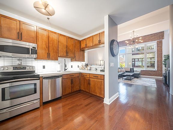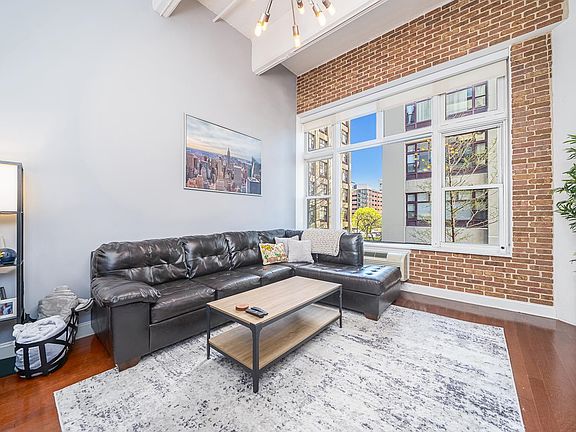 Discover this highly sought after 1 Bedroom 1 Bathroom residence at the elite Hudson Tea Building in uptown Hoboken. This spectacular 1000 square foot home is the largest one bedroom layout in the building! This home boasts 13' ceilings accented by concrete beams and expansive windows. The large floor plan is ideal for privacy and also great for entertaining. The Chef's kitchen features an open layout with stainless steel appliances, custom cabinetry, quartz countertops and breakfast bar overlooking the dining nook. Enter the living area in this bright and open floor plan to gleaming hardwood floors and charming Brick surrounding the windows . Primary suite is large enough for a King size bed, and features a deep walk in closet. To add to the conveniences of this home it has an in unit Washer and dryer. Building amenities include 24-Hour full service concierge, state of the art fitness center, resident's lounge, children's playroom, on-site dry cleaner, coffee shop and a private shuttle to the Path included for residents . Located on the prestigious Hudson River waterfront, you won't want to miss this one!