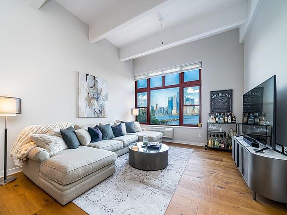 Imagine coming home to panoramic views of the NYC skyline and Hudson River in every room of your home. Rarely available, this spectacular waterfront loft with 2 bedrooms and 2 bathrooms is situated in the historic Hudson Tea Building on Hoboken’s magnificent Hudson River Walkway promenade. This residence boasts soaring 14ft high ceilings, spacious rooms and stunning architectural elements from its industrial past including beamed concrete ceilings, massive columns, and oversized windows. Its generous great room, framed by a living work of art: serene and inspiring water and city views, is your canvas to create your idyllic living, dining and entertainment ambience. The open style kitchen features stainless steel appliances, granite countertops and breakfast bar, porcelain tile backsplash, undermount sink and abundant white shaker cabinets. Your sanctuary will be the massive primary bedroom with its own en-suite bathroom and spacious walk-in closet with bonus space for your home gym or Peloton studio. The ample second bedroom boasts more great ceiling height, breathtaking views and generous closet space and can easily accommodate your “working from home” needs. Additionally, this home offers in-unit washer dryer and custom Hunter Douglas light control blinds. All of this in uptown Hoboken’s most exclusive and desirable luxury community with 24-hour concierge, award-winning French Cafe, shuttle to the PATH, newly redesigned kids’ playroom and uber-luxe residents’ lounge with fireplace, bar, billiards, and dining room. Plus, on site is an enviable 3,000 sf resident fitness center offering a full calendar of yoga, Barre & HIIT classes. The iconic Hudson Tea Building once served as Lipton Tea’s manufacturing and shipping headquarters. Today, it stands in a park-like setting with riverfront promenades, steps away from Hoboken’s best markets, restaurants, museums and theaters, and effortless access to NYC via ferry, bus or PATH and rental parking available nearby.