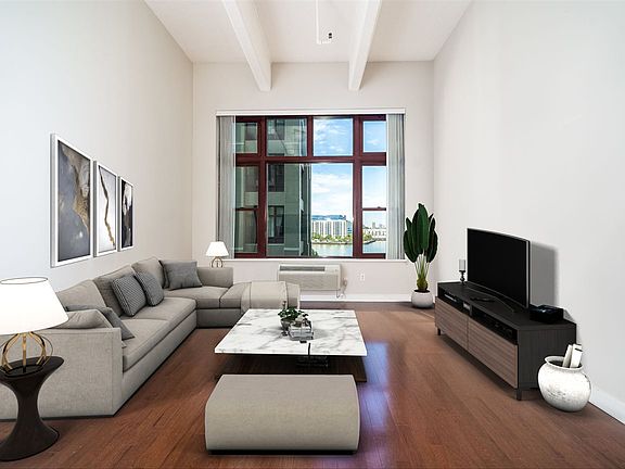 Discover this inviting 1200 sqft 2 bed/2 bath condo featuring river views at the Hudson Tea Building WITH PARKING! This residence is located on Hoboken's prestigious waterfront and boasts 14' ceilings accented by concrete beams and massive sun drenching windows. The open and airy floor plan is perfect for entertaining and privacy. The modern kitchen features loads of cabinetry, stainless steel appliances, granite countertops, custom backsplash and a brand new Kitchenaid oven. Generous master bedroom features double closets and en-suite bath. The second large sized bedroom includes double closets and direct access to the dual entry modern bath with laundry. This updated home has hardwood floors throughout, recessed lighting, and multiple ceiling fans. Building amenities include 24-Hour full service concierge, state of the art fitness center, resident's lounge, children's playroom, coffee shop and a private shuttle to the Path. One covered, deeded parking spot is included with the unit.