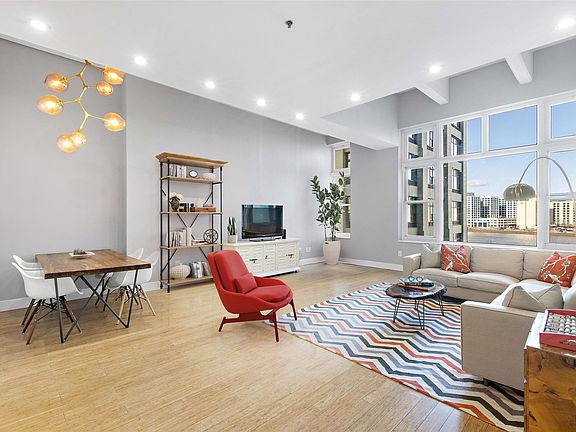 Residence 4V at The Hudson Tea Buildings is an exceptional 1320 SF 2 bedroom, 2 bathroom loft that includes a 24-hour concierge, free shuttle to and from Hoboken Terminal (PATH, Ferry, NJ Transit, Light Rail), and garage parking for one car. It is extraordinary for its open, flexible layout, expansive views that encompass the Hudson River, Weehawken Cove and the Palisades, incredible all-day light, 14-foot ceilings with exposed concrete beams, and its amenity-laden environs. This sublime setting offers unrivaled access to the Hudson River Waterfront Walkway, NY Waterway Ferry at 14th Street, express bus to New York City, and is easily walkable to Trader Joe’s, Whole Foods, the Uptown farmers' market and an exciting array of boutique shopping, dining, coffee shops and parks/playgrounds that make The Mile Square City so special. The uniquely oversized open-concept living and dining area is illuminated by 10-foot windows and an updated kitchen incorporating white lacquer flat panel millwork, a full suite of Bosch and LG stainless steel appliances, and a sleek island with mitered edge and bar seating. The private owner's suite is accentuated by a walk-in closet and an en-suite bathroom. The second bedroom offers ample room for a play and/or work area as well as excellent closest space and lofted storage, while the easily accessible guest bathroom showcases a crisp white vanity. Life at home in Residence 4V is further enhanced by an in-home washer/dryer, spacious foyer with walk-in coat closet and pantry, and recessed LED lighting. Statuesquely situated along the edge of the Hudson River overlooking New York City, The Hudson Tea Buildings is an iconic, meticulously maintained community. In addition to a dedicated, skilled service staff, it offers residents and their guests superlative amenities including an updated 2700 SF fitness center featuring Peloton bikes, free daily classes and locker rooms; children's playroom; resident's lounge; free shuttle to and from Hoboken Terminal; on-site dry cleaner; and Choc-O-Pain, a French bakery and cafe. All hallways were updated last year and a refined, contemporary lobby, as well as a redesigned lounge and communal work from home space, are forthcoming. Maintenance fee for garage parking space is $85 monthly. Some images are virtually staged.