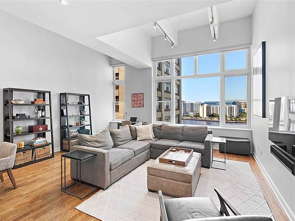 Discover this highly sought after 2 Bedroom 2 Bath residence with Water Views at the Hudson Tea Building. This residence is located on Hoboken's prestigious waterfront and boasts 13' ceilings accented by concrete beams and sun drenching windows. The floor plan is ideal for privacy and entertaining. The Chef's kitchen features a Wolf oven and induction stovetop, marble quartz countertops, double stacked cabinets, Moen touchless faucets, Marvel built wine fridge and GE stainless steel Refrigerator and Microwave. Dark hardwood floors , custom closets, ceiling fans, track lighting and an open kitchen are one of the many upgrades that make this residence stand out. Building amenities include 24-Hour full service concierge, state of the art fitness center, resident's lounge, children's playroom, on-site dry cleaner, coffee shop and a private shuttle to the Path. A covered parking spot is also included.