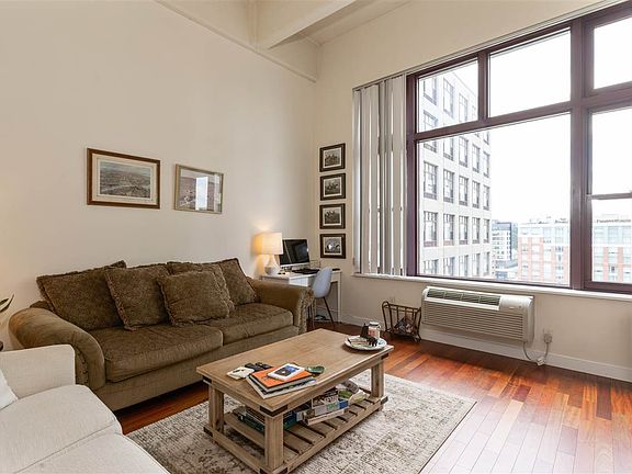 TRUE one bedroom loft at the Hudson Tea! You will love the privacy that a true one bedroom affords vs the typical studio layout especially now if working from home. Located on the beautiful Hudson River waterfront with scenic promenade, this beautiful apartment boasts 13' ceilings and large picturesque windows allowing for tons of natural light. Separate living and dining areas are easily configurable in the spacious, open layout. The modern, white kitchen has enough cabinetry for all of your cooking needs. Generously-sized bedroom has plenty of room for a home office set-up as well as a coveted walk-in closet. Additional highlights include hardwood flooring, brand new heating/cooling unit in bedroom, two-year young stainless steel dishwasher and convenience of an in-home washer & dryer. Building amenities include 24-Hour full-service concierge, state-of-the-art 3,000 square foot Fitness Center with Peleton bikes, Resident's Lounge, Children's Playroom, cleaners, Choc-o-Pain and a private shuttle with app tracking to the PATH. Complex is within a five-minute walk to either NY Waterway ferry or NJ Transit buses. Available for immediate occupancy. No pets.