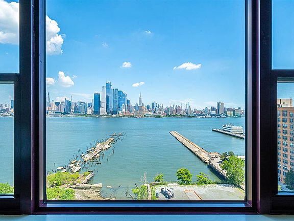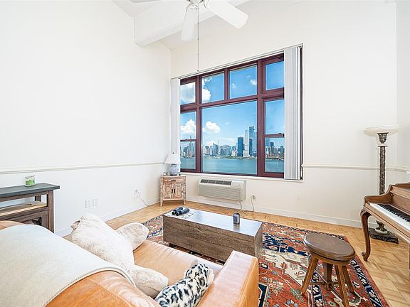 Create your dreams on this blank canvas with direct east facing views of NYC in the coveted Hudson Tea Building. With its soaring 14 feet ceilings, this upper floor unit comes fully equipped with GE Profile s/s package, fridge, newer A/C units, w/d in unit. Both bedrooms are equipped with walk in closets and one has built in office with pull out Murphy Bed. Condo includes 1 uncovered parking space. The Hudson Tea community offers a 24 hour doorman, fitness center with Peleton bikes, resident lounge, children's playroom, shuttle service to and from Hoboken Terminal & Path, on-site dry cleaner, and an onsite coffee shop. Enjoy uptown Hoboken living at its best with restaurants, bars, shops and transportation with an easy commute to Manhattan via Ferry, bus, and Hoboken PATH.