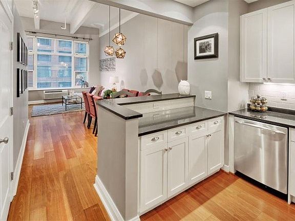 NEWLY RENOVATED one-bedroom alcove featuring hardwood floors, 13 ft ceilings, and true dining area with custom pendant lighting. Fully equipped open kitchen with granite counters, stainless steel appliances and breakfast bar. Large living room is sun drenched with 8 x 10 ft southern exposure window. Bedroom includes dressing area with abundant storage. Upgraded bathroom. Washer/dryer in unit. FREE SHUTTLE to the Hoboken PATH, 2 blocks away from bus to Port Authority and steps away from the waterfront/Ferry. 30 MINS door to door to downtown NY Financial District and 25 MINS door to door via #126 bus to Port Authority. Short walk to Trader Joe's for shopping convenience. One block from the beautiful Hoboken waterfront walkway. Hudson Tea offers 24 Hour Doorman, Gym, Children playroom and Community Room. Tenant pays condo move-in and move-out fee of $250. No other condo fees otherwise. Unfurnished apt: $2900 (EQUIVALENT to $2,675 if there was a one-month broker fee) Covered parking: $260 Payments upon signing: First month's rent One and half month security deposit Minimum 1-year lease. No brokers please. Tenant responsible for electric.