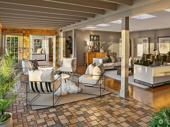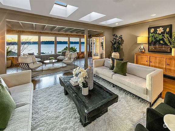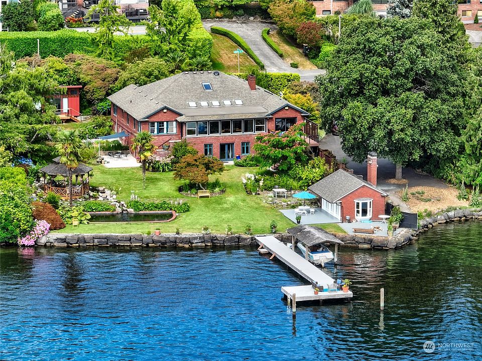 The lifestyle is easy, comfortable, and ready for your guest to arrive by boat and say hello. Your day begins with idyllic decisions to consider ... paddle, swim, sail, wakeboard or coffee on the 75' dock. At nearly an acre, this legacy property is spread across 120' of Lake Washington waterfront. The grounds are punctuated with established gardens, meandering creek, reflecting pool, and enclosed with a handsome brick wall for the utmost privacy. Inside, walls of windows invite natural light and mesmerizing lake and mountain views. Flexible living spaces are ideal for entertaining groups of all sizes. The lower level presents an expansive family room which opens to the east lawn and guest suite, an ideal home for multi-generational living.