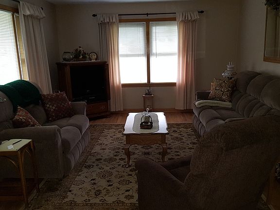 3 Bedroom, 2 bath, living room, dining room, kitchen with appliances corian counters and sink, oak hardwood floor thru out. All walls and ceilings are plaster.Full basement has a drop ceiling and is dry. 2 car attached garage. Room size is kitchen 14'4" X 9' 4" Dining room 12' 9" x 10' Living room 18'2" x 12'9" master bedroom 12'9" x 14'7" spare bedroom 12'9" x 12'6" spare bedroom 11' x11'7", main bathroom 11' x7'.