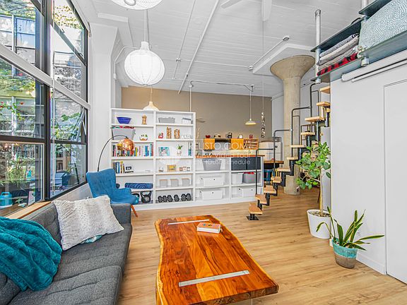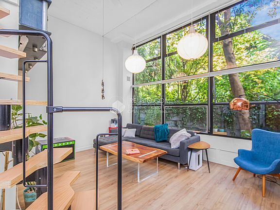 Experience stylish loft living in this beautifully designed 1-bedroom, 1-bath live/work space located in the award-winning, Emeryville Warehouse Lofts. This serene home offers a seamless blend of modern design while being surrounded by natural beauty. The open-concept kitchen, dining, and living area features warm custom wood floors with lots of custom built in storage, and a full wall of windows that fills the space with natural light. The mezzanine bedroom overlooks the living area and sits above a generous wall of closets, offering great storage, and features a ceiling-mounted projector for comfortable, screen-free viewing. The large bathroom has a tub. Enjoy the sounds and greenery of the lush central courtyard filled with palms, ferns, and a cascading 5 story waterfall sculpture, with your own outdoor space perfect for relaxing with a chair or small table.