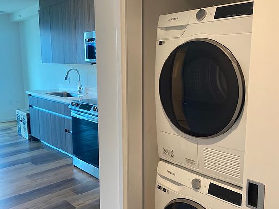 1 bathroom unit with bathtub, full kitchen with mounted microwave, and washer and dryer in unit.