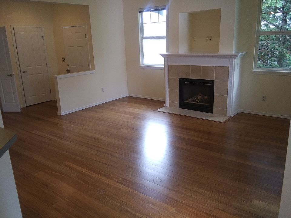 Private gated condo community. Private entrance and private garage. Sit outside without hearing any freeway or traffic. Nice generous home layout (not space-efficient apartment layout) Genuine Bamboo hardwood floors. Lots of windows with southwest exposure gets lots of light. New carpet in bedrooms. cathedral ceiling top floor unit. Gas fireplace with fan. W/D. Private one car Garage with opener and lots of shelving for storage for bikes & belongings, plus extra parking spot inside gated community. 7 storage closets including pantry in kitchen. updated stainless appliances. Furnished clubhouse with gym and full kitchen. Two blocks from covered bus stop to main transit center. Three blocks to local food/pub/etc. 6 blocks to Uwajimaya, Starbucks, Rite-aid, etc. This is a small quiet community of condo owners with a very limited rental limit. A good chance to get in a community with long term neighbors. Owners pays homeowners association dues and water. Tenant pays power, cable & wifi. Terms available for deposit.