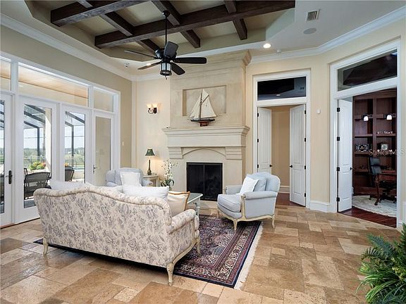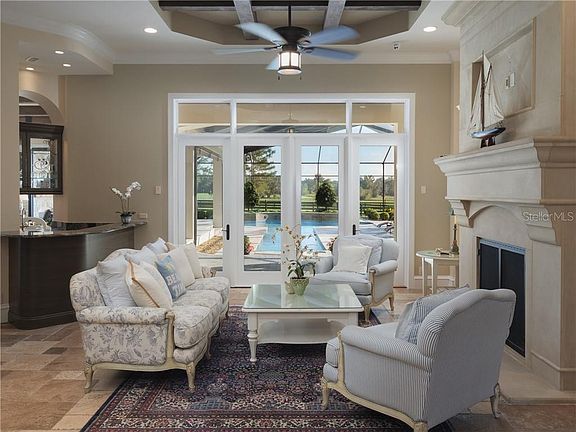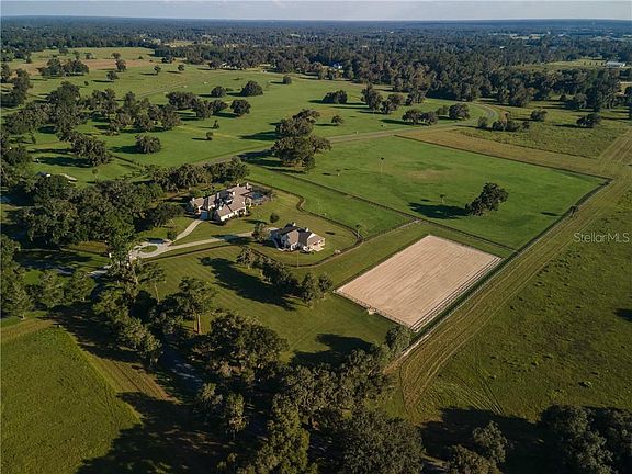 Perched atop a rolling knoll with simply stunning views, is this truly exquisite executive estate with a 4-stall show barn and attached guesthouse. This 20+ acre sport horse paradise has bountiful Granddaddy Oaks, fenced/cross fenced grass pastures, and an enormous 150' x 300' riding arena. It is located across from the Florida Horse Park, and has a private trailhead with horse trailer parking on the Florida Greenway. It's just 20 minutes to the new World Equestrian Center! The home has an open floor plan with 4 bedrooms, 5+ baths, and a 4-car garage. This executive home will meet the demands of the most discerning buyers. Amenities include a grand gourmet kitchen, breakfast room, family room, living room with gas fireplace a magnificent arched stone entry dining room with custom millwork and French doors, home theater, and two separate offices. The large master suite features hardwood floors and new walk-in closets, a luxurious master bath with walk-through shower and dual water closets, and bonus exercise room with sauna. There's also a laundry room with tiled dog shower. The gorgeous covered outdoor entertaining space features stone surround gas fireplace, summer kitchen and pavilion, and a flowing saltwater pool, lap lane, and spa. The entire home and horse facility is secured with live streaming cameras and video, along with a state of the art security system. The concrete block center-aisle show barn features 4 large rubber matted 12' x 15' stalls, fly spray system, air-conditioned feed room, tack room and bath; there's also a quaint 1BR/1BA apartment for your guests or farm manager. This meticulously landscaped farm has beautiful Granddaddy oaks, 4 board fencing, 3 large paddocks, dusk to dawn outdoor lighting, irrigation, and much more. For the enthusiast, there are miles of tree lined riding trails and paths providing endless opportunities for horse or bike riding, hiking, jogging/walking in a safe and serene atmosphere. Adjoining acreage may be available for purchase.