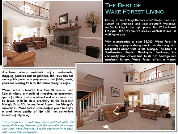 The Best of Wake Forest Living Moving to the Raleigh-Durham area? Prefer quiet and custom to crammed and cookie-cutter? Welcome, youre looking in the right place. The Wake Forest lifestyle - the way youve always wanted to live - is waiting for you. With a population of over 35,000, Wake Forest is continuing to play a strong role in the steady growth recognized nation-wide in the Triangle. The home to Southeastern Baptist Theological Seminary, the community has stayed true to its rich heritage and academic history. Wake Forest offers a vibrant downtown where residents enjoy restaurants, shopping, festivals and art galleries. The town also has many public parks with playgrounds, ball fields, ponds, pools and walking trails for the whole family to enjoy. Wake Forest is located less than 10 minutes from Raleigh where a wealth of shopping, entertainment, sports facilities, and educational and arts venues can be found. With its close proximity to the Research Triangle Park, RDU International Airport, the Triangles universities, Wake Forest is the perfect place to enjoy a small town quality of life with the convenient benefits of city living. Wake Forest has a small town charm and feel while still being within easy distance of all the amenities of a larger city. Also, Wake Forest has a really nice diversity in ages, with retired folks and families. (one of your new neighbors) A great lifestyle is more than just shopping and nightlife, you need to have awesome living options as well. Clear Springs, an executive neighborhood adjacent to the award-winning Heritage Golf Course, offers a great selection of custom homes. It offers large private lots and quality construction without the large community fees of similar developments. One of the nicest homes in Clear Springs is currently being offered for purchase. 1500 Sand Hollow Circle offers a wide open floor plan and a beautiful master bedroom on the first floor. You will be proud to welcome your guests onto the wide front porch. Upon entering the foyer, there is a large formal dining room to the left, decked out with beautiful wainscoting and custom trim details. To the right, the two-story great room is anchored by the beautiful stone fireplace. The space is stunning, and can also be enjoyed from the second story bridge. The kitchen and breakfast nook are open to the great room at the rear of the home. French doors lead to the screened porch and shady deck in the back yard. The master suite has a beautiful trey ceiling and is surrounded with large windows. You will surely appreciate this owners retreat. Upstairs, this fantastic home has two bedrooms and two unique bonus rooms - either of which could also be used as additional bedroom space. There are also two bathrooms to accommodate these bedrooms. The home also has a great basement space that is currently used as a workshop. It could easily be finished for additional living area if desired. It is difficult to fully understand the unique attractive features of this home. And while we have provided many additional pictures, virtual tour, and other details on our website, its really best just to experience it in person. Wed be happy to give you a personal tour!