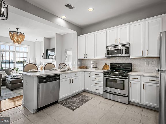 Lowest condo fees in Baltimore with WATER VIEWS from every room and GARAGE PARKING! The open concept living area with a gas fireplace draws you in with fantastic water views right as you step in this condo. The kitchen has stainless steel appliances, including a gas stove (which is truly rare in a condo) wood cabinets, tile floors, pantry, and corian counter with a breakfast bar. Both bedrooms have water views and en-suite bathrooms. The primary suite is large enough for a king bed and has a walk in closet. Full size washer/ dryer in unit. Centrally located with easy access to Fells Point, Harbor Point, and Harbor East, and downtown. Restaurants, bars, coffee shops, and shopping are all around, as is public transportation including the Water Taxi, the free Harbor Connector, JHU bus (stops at the corner of Bond and Thames), and the free Charm City Circulator bus (stops at Caroline and Thames)