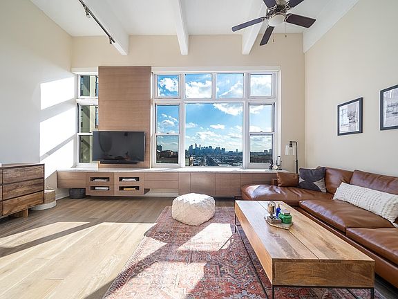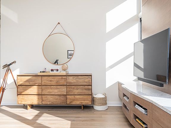 Spacious bathroomWide plank flooringCustom electric roller shadesSleeping alcoveCustom built-insStainless steel appliancesWhite shaker cabinets