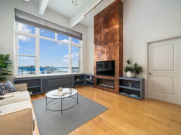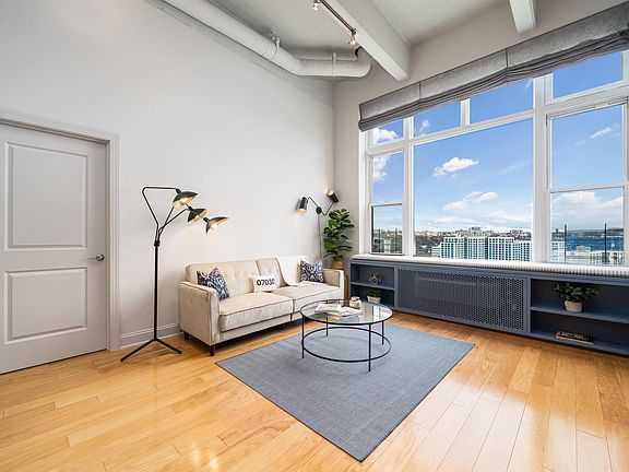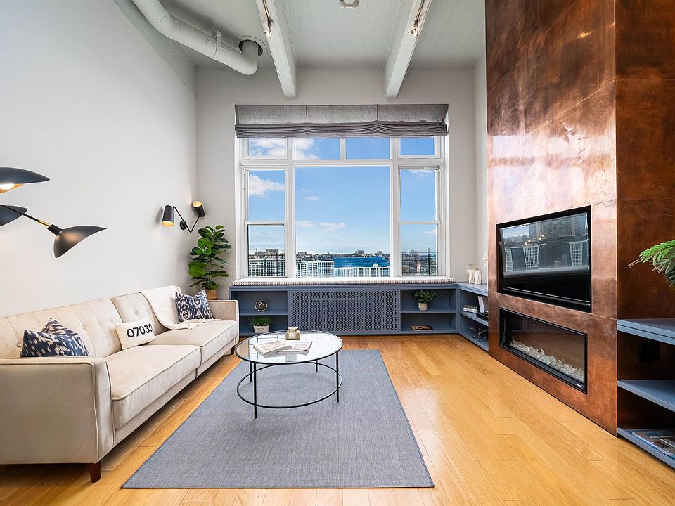 Welcome to Penthouse Residence 12L, a rare gem perched high above the vibrant skyline of Uptown Hoboken, offering an unparalleled urban oasis with breathtaking northern waterfront views of the Uptown Hoboken Cove & NYC skyline. This exceptional 2-bedroom, 2-bathroom penthouse boasts a seamless fusion of contemporary design and industrial chic, featuring soaring 14-foot ceilings adorned with exposed raw industrial beams and 10-foot picture windows that flood the space with extraordinary all-day light and panoramic vistas. Step into luxury living with a built-in electric fireplace accented by a custom copper millwork entertainment center, perfect for cozy evenings, while window seating invites hours of daydreaming amidst the stunning backdrop of the cityscape. This meticulously curated home offers an upgraded open chef's kitchen, crafted with stone countertops, chic blue/grey cabinetry, stainless steel appliances, and a reverse osmosis water filtration system for pure, delicious drinking water. The king-sized primary suite is a sanctuary of comfort and convenience, featuring added overhead loft storage, custom closet organizers, and a spa-like ensuite bath with double sinks and a glass-enclosed tub. The second bedroom, equally spacious and versatile, boasts extra added attic loft storage, closet organizers, and its own upgraded ensuite bath with glass enclosed tub & both bedrooms have custom shades. Experience elevated living with wide plank all-natural hardwood flooring, in-unit washer and dryer laundry, custom electric shade in living room, West Elm lighting fixtures, and MinkaAire fans throughout. Convenience is paramount with covered premium 5th-floor garage parking near the elevator included at the LAZ garage across the street at 1450 Bloomfield. Indulge in the unparalleled amenities of Hudson Tea, offering a full suite of services including a 24-hour concierge, nearly 3000 sqft gym with Pelotons and included fitness classes, stunning resident's lounge with private dining room offering Midtown views, a new free WFH space, redesigned kid's playroom, 3 high-speed elevators, free shuttle to/from PATH, dry cleaner, Choc O Pain French cafe onsite, and resident's courtyard with fire pit perfect for alfresco dining. Additional amenities include bike storage and a forthcoming grocery market. Located directly on the Uptown Hudson River waterfront, enjoy proximity to neighboring Harborside & Maxwell Parks, boutique shopping, outdoor eateries, Soul Cycle, Pilates, spas, Cork Wine shop, and easy access to transportation including the Direct 14th St Ferry to Midtown & WFC. With Trader Joe's, Whole Foods, farmer's market, and Dumbo Grocery Market coming soon, every convenience is at your doorstep. Elevate your lifestyle to new heights with Penthouse Residence 12L, where luxury living meets urban sophistication in the heart of Hoboken. Schedule your private viewing today and experience the epitome of modern elegance!