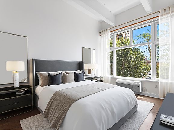 Retreat home to this very rarely available (with Parking included!) "A-line", 1 bed + den, 2 full bath, south-facing Loft with 14' ceilings, exposed beams and raw concrete column at the esteemed enclave, the iconic Hudson Tea Building, on the banks of the Hudson River. Residence 2A overlooks the great green lawn from your 10 foot picture windows, while the neighboring trees provide the calm, peace, tranquility, and privacy of a large suburban estate. This renovated and turnkey home boasts a total of 1100 sq ft of living space in a stunning open floorplan, with beautiful hardwood floors throughout, and the private primary suite includes a newly renovated (2021) en-suite, spa-like, marble-clad bathroom, and spacious closet. The den, enclosed with a stylish and functional Barnyard door, offers ample room for a queen sized bed, office space, home gym or nursery, along with plentiful closet space. The kitchen features an abundance of gorgeous Cherry wood cabinets, beautiful granite counter tops, and stainless steel appliances, including dishwasher, and new high-end Samsung range. Additional upgrades to the home include a new in-unit washer/dryer, and both PTAC wall units. The Hudson Tea's full service amenities suite includes 24-hour concierge, FREE shuttle to/from the PATH, ~3000 sqft gym with included fitness classes (adult & kids yoga, barre & HIIT classes), resident lounge with fireplace, wet bar & dining room, kids redesigned playroom coming soon, 3 modernized high-speed elevators, and a dry cleaner and Choc-O-Pain French cafe onsite! Hallways recently upgraded, and new shared WFH space coming soon! Located directly on the Uptown Hudson River waterfront, neighboring Harborside Park, vibrant boutique shopping & outdoor eateries, Ferry to Midtown & WFC, Trader Joe's, Whole Foods, and the Uptown farmer's market. Come experience this rarely available dream home today! Parking space included at the 1450 Laz Garage conveniently located across the street! Definitely A Must See!