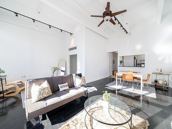 In search of a South Facing, sundrenched, 2 bed 2 bath under $1mm at the iconic Hudson Tea? Your search is over with this highly coveted and rarely available "A" Line, 1 bed + den Loft, with 1100 very well laid out sqft of living space, on the Uptown Hoboken Hudson River Waterfront! Upon entering Residence A, you'll appreciate the open floor plan, soaring 14 foot ceilings with exposed concrete beams, and abundance of natural sunlight from your 10 foot picture windows overlooking the lush, tree-lined great lawn below. The spacious den, easily fitting a queen bed with a very large double closet and additional overhead loft storage, has already been fully enclosed, floor to ceiling, with smart pocket doors & a light transom above allowing the natural light in yet privacy and quiet of a true bedroom, nursery or office. The primary bedroom with stellar views down vibrant Washington St. has an en-suite full bath and closet that can be expanded adding more storage space. The kitchen has upgraded stainless steel appliances, abundant 42" white shaker style cabinetry and overhead shelves that can be removed to open up the space with the breakfast bar overlooking the dining and living room area plus a rarely offered, full sized pantry closet. Off to the right, southeast corner of the home, is a perfect bonus area for an office, workout space or playroom area! With its blank canvas perfect for updating as you see fit, this home has great structural bones with its new Freidrich PTAC heating and cooling units, new washer and dryer, new blinds, added ceiling fans and custom lighting & was just freshly custom painted w/Benjamin Moore paint! Investors will love the low price per square foot at less than $800/ft. compared to most 2 beds in the building as well as lower HOAs and taxes!! At <$1mm you also avoid NJs mansion tax at closing as well; a win-win for any discerning buyer looking for more space. The Hudson Tea's full-service amenities suite includes 24 hour concierge, nearly 3000 sqft gym with Pelotons, included fitness classes (adult & kids yoga, barre & HIIT classes), stunning residents lounge incl. private dining room with views of Midtown, new free WFH space, kids redesigned playroom coming soon, 3 high-speed elevators, FREE shuttle to/from PATH, indoor storage & bike storage available, dry cleaner, & Choc O Pain French cafe onsite! Located directly on the Uptown Hudson River waterfront, with neighboring Harborside & Maxwell Parks, vibrant boutique shopping & incredible outdoor eateries, Soul Cycle, Pilates, Spas, Cork Wine shop, Direct Ferry to Midtown & WFC, few quick blocks from Trader Joe's, Whole Foods, farmer's market and Dumbo Market coming soon! Garage rental parking available for an add'l fee across the st. at the Laz 1450 Bloomfield St.
