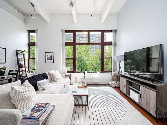 Your unique opportunity is finally here in this rarely offered, oversized, South Facing true 1 bedroom, 1 bath loft with nearly 900 sqft & garage parking included at the iconic Hudson Tea Building on Uptown Hoboken's waterfront Hudson River cove! Upon entering this coveted "C" line residence, tucked away at the end of the hall giving you peace and tranquility, you are greeted with a proper entryway foyer with an abundance of closets for storage needs. You'll truly appreciate the functionality and spaciousness of this layout with its soaring 14' lofted ceilings with exposed original concrete beams. The open concept chef's kitchen with all stainless steel appliances, endless amounts of white shaker style 42" cabinetry and stone countertops with breakfast bar that overlooks the spacious dining and living room area with 10' picture windows showcasing the tree lined views of the lush green gardens and great lawn of the Tea that you might miss being on a higher floor. The spacious bedroom is ideal for privacy located down the hall, and has a generously sized closet and the oversized bathroom and laundry are convenient just steps from the bedroom. With all natural hardwood floors, updated lighting, and GE stacked laundry in-unit, and a covered garage parking space included, this stylish home checks all the boxes should you need more space! The Hudson Tea's full service luxe amenities suite includes 24 hour concierge, nearly 3000 sqft gym with Pelotons, included fitness classes (adult & kids yoga, barre & HIIT classes), stunning residents lounge incl. private dining room with views of Midtown perfect for your next dinner party, new free WFH space, brand new kids redesigned playroom, 3 high-speed elevators, FREE shuttle to/from PATH, dry cleaner, & Choc O Pain French cafe onsite & common courtyard coming soon! Located directly on the Uptown Hudson River waterfront, with neighboring Harborside & Maxwell Parks, vibrant boutique shopping & incredible outdoor eateries, Soul Cycle, Pilates, Spas, Cork Wine shop, Direct Ferry to Midtown & WFC, few quick blocks from Trader Joe's, Whole Foods, farmer's market and Dumbo Grocery Market coming soon! Garage parking space included!
