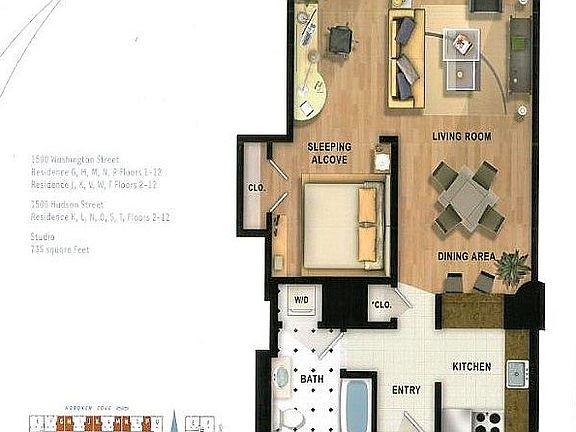 No Fee Rental. Modern Renovated Studio Alcove w/ Parking. 24 Hour Concierge Service, Southern Exposures of Washington Street, Downtown Hoboken and JC. Easy walk to Trader Joe's, Kings, Whole Foods-Weehawken, the weekend Farmers Market and multiple waterfront parks. Choc-O-Pain Bakery now open. 735 SQ FT of Open Loft Living with 13 foot Ceilings, Unit is move in ready and offers New hardwood floors, AC/Heater and W/D, covered parking included. Building offers Club Quality Gym. Shuttle service to PATH and convenient to Buses and Ferry, Multiple uptown dining options. 1 year lease required with covered parking, $250 move-in fee Credit Check required, No Pets or Smokers please. Owner-Landlord is a Licensed NJ R/E Agent. Thank you