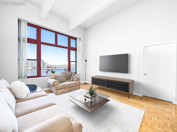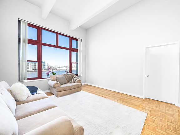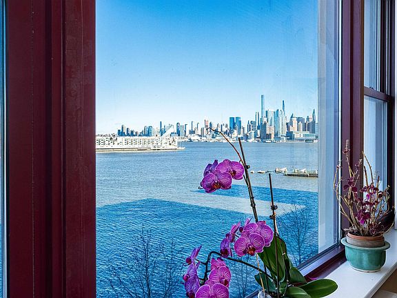 Explore the untapped potential Residence 4I, an 1155 sqft 2 bed 2 bath gem with breathtaking waterfront views of the Uptown Hoboken Cove & NYC from every 10ft picture window. This canvas of possibilities comes with parking offering you the perfect space to craft your dream home at the iconic Hudson Tea. Imagine transforming the kitchen into a chefs haven opening up to a spacious dining area-your ideal setting for entertaining awaits. The king-sized primary suite can be renovated to include great storage, a spa-like ensuite with double sink and glass enclosed shower and closet customization! The second bedroom, also big enough for a king bed, can also be converted to a 2nd bedroom + den or a big walk-in closet with attic storage above! Come and renovate to your heart's desire with your interior designer or GC in tow and own a piece of Uptown Hoboken's iconic luxury amenity Tea Building! See photos of similar units and renderings of what could be done. This property has also been virtually staged to showcase its potential! Covered 7th floor garage parking included at the LAZ garage across the street at 1450 Bloomfield. The Hudson Tea's full-service amenities suite includes 24 hour concierge, nearly 3000 sqft gym with Pelotons, included fitness classes (adult & kids yoga, barre & HIIT classes), stunning resident's lounge incl. private dining room with views of Midtown perfect for your next dinner party, new free WFH space, brand new kid's redesigned playroom, 3 high-speed elevators, FREE shuttle to/from PATH, dry cleaner, & Choc O Pain French cafe onsite & common courtyard with fire pit & bike storage coming soon! Located directly on the Uptown Hudson River waterfront, with neighboring Harborside & Maxwell Parks, vibrant boutique shopping & incredible outdoor eateries, Soul Cycle, Pilates, Spas, Cork Wine shop, just 2 blocks to Direct 14th St Ferry to Midtown & WFC, few quick blocks from Trader Joe's, Whole Foods, farmer's market and Dumbo Grocery Market coming soon!