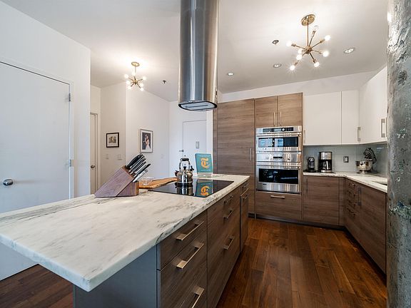 In search of a South Facing, sundrenched, 2 bed 2 bath under $1mm at the iconic Hudson Tea? Your search is over with this highly coveted and rarely available "A" Line, 1 bed +Den Loft, with 1100 very well laid out sqft of living space, on the Uptown Hoboken Hudson River Waterfront! Upon entering Residence 5A, you'll immediately appreciate the uniquely open floor plan, soaring 14 foot ceilings with exposed concrete beams, and abundance of natural sunlight from your 10 foot picture windows overlooking the lush, tree-lined great lawn below. The stunningly upgraded chic Euro-style kitchen, fit for the most discerning chef, is complete with Alno cabinetry & Danby marble counters, including a rarely found center island with exhaust, Liebherr seamless/built-in fridge, GE Monogram Advantium Speedcook double wall oven, Monogram 5-burner induction cooktop, Bosch dishwasher and pantry closet! This kitchen leading into the spacious dining and living room is really a showstopper you'll be proud to host all your guests in! The private kingsized primary suite, tucked to the east wing of the loft, with stellar views down vibrant Washington St. has a spalike en-suite full bath with tub shower, upgraded vanity, and closet that can certainly be expanded out and up adding more storage space! The spacious den, easily fitting a queen bed with a very large double closet and additional overhead loft storage, can easily be fully enclosed similar to other A line units, floor to ceiling, with pocket doors or a barn style door for efficient use of space & a light transom above allowing the natural light in yet privacy and quiet of a true bedroom, nursery or office. Off to the right, southeast corner of the home, is a perfect bonus area for an office, workout space or playroom area! The whole package is truly complete with all natural wide plank "Mirage Knotty Walnut" hardwood floors, custom lighting & shades throughout, and full sized stacked laundry in-unit. Investors will love the low price per square foot at less than $900/ft. compared to most 2 beds in the building as well as lower HOAs and taxes!! At <$1mm you also avoid NJs mansion tax at closing as well; a win-win for any discerning buyer looking for more space. The Hudson Tea's full-service amenities suite includes 24 hour concierge, nearly 3000 sqft gym with Pelotons, included fitness classes (adult & kids yoga, barre & HIIT classes), stunning residents lounge incl. private dining room with views of Midtown, new free WFH space, kids brand new redesigned playroom, 3 high-speed elevators, FREE shuttle to/from PATH, indoor storage & bike storage available, dry cleaner, & Choc O Pain French cafe onsite! Located directly on the Uptown Hudson River waterfront, with neighboring Harborside & Maxwell Parks, vibrant boutique shopping & incredible outdoor eateries, Soul Cycle, Pilates, Spas, Cork Wine shop, Direct Ferry to Midtown & WFC, few quick blocks from Trader Joe's, Whole Foods, farmer's market and Dumbo Market coming soon! Covered garage Rental parking available @LAZ garage across the street @1450 Bloomfield for an add'l small monthly fee or for sale by owner (when available) for cash.