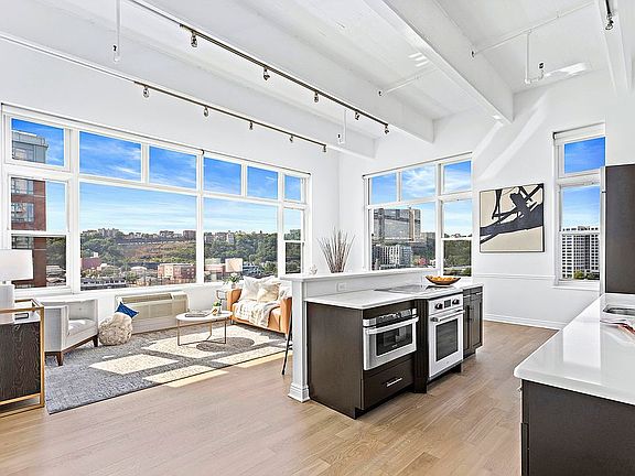 Loft living along the Hudson River reimagined. Extraordinary for its open, flexible layout, expansive, unobstructed views northeast and west that encompass the Hudson River, New York City, Weehawken Cove and the Palisades, incredible all-day light, 14-foot ceilings with exposed concrete beams, and its amenity-laden environs within the esteemed waterfront enclave, The Hudson Tea Buildings, Residence 6E is an exceptional 1350 SF 2 bedroom, 2 bathroom corner loft that includes a 24-hour concierge, free private shuttle with direct service to and from Hoboken Terminal (PATH, Ferry, NJ Transit, Light Rail), and is just a two minute walk to the NJ Transit express bus that services Port Authority and a four minute walk to the NY Waterway Ferry at 14th Street that services both Midtown and Brookfield Place. An oversized, open-concept U-shaped living and dining area with room for a dedicated home workspace is illuminated by 10-foot windows that embrace a completely updated and renovated open kitchen with 36-inch Sub-Zero refrigerator, 36-inch Wolf induction cooktop, Wolf convection oven and microwave drawer all seamlessly incorporated into rich, espresso-stained low profile shaker millwork, granite countertops and custom tile backsplash. An island with bar seating and the boundless possibilities afforded by the living space allow for uncompromised, easy living and effortless entertaining ensuring that you, your family and your guests will experience home and life on the Hoboken waterfront like never before. The private master suite is lined by three extra-deep closets and includes an en-suite bathroom bounded by imported stone with smartly contrasting chrome fixtures. The sizable second bedroom, located at the opposing end of the loft, offers excellent storage, and the easily accessible guest bathroom showcases a deep soaking tub, imported stone and chrome fixtures. Residence 6E is further enhanced by recently refinished white oak hardwood flooring throughout, in-home washer/dryer, custom window treatments from The Shade Store, track lighting, and a spacious foyer with oversized coat closet. Secure, covered garage parking is guaranteed available to rent or purchase. Statuesquely situated along the edge of the Hudson River overlooking New York City, The Hudson Tea Buildings is an iconic, meticulously maintained community that offers unmatched access to all forms of transportation, the Hudson River Waterfront Walkway, and everything that makes Hoboken and New York City so special. In addition to a 24-hour concierge and a dedicated, skilled service staff, The Hudson Tea Buildings offer residents and their guests superlative amenities, including a 2700 SF fitness center featuring all new equipment, internet-connected Peloton bikes, free daily classes and locker rooms; children's playroom; resident's lounge; free shuttle to and from Hoboken Terminal; on-site dry cleaner; and Choc-O-Pain, a French bakery and cafe.