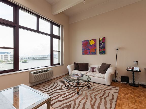 Most attractive studio layout in Hoboken, lives like a large one bedroom! Enjoy complete privacy from this rare waterfront loft. Dramatic 13' Ceilings, exposed concrete beams, washer/dryer, & 10'x12' picture windows...Experience the convenience of Hudson Tea's full-service amenities including 24hr Concierge, Private Shuttle to PATH, State-of-the-Art Fitness Center, Residents' Lounge, Childrens' Playroom, 3 min walk to Bus/Ferry. Prime Uptown Hoboken Location!(LANDLORD PAYS 1/2 BROKERS FEE!!)
