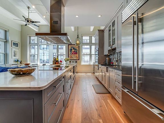 Spectacular fully renovated corner unit in Hudson Tea. Soaring 15ft ceilings, wide plank wood floors, California Closets throughout, and oversized windows that flood the home with natural light. The kitchen is a chef's dream with an expansive 15.5ft island, quartz countertops, wolf appliances, sub zero refrigerator, wine fridge and tons of storage space. Three well sized bedrooms with generous closets, multiple hall closets + an additional 90 sq ft attic above the foyer. Full service building with great amenities including gym, children's playroom, PATH shuttle, resident's lounge and 24 hr concierge. One deeded garage parking spot included.