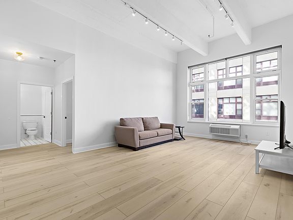 Featuring a remarkable open, flexible layout, and south facing, incredible all-day light, 14-foot ceilings, in amenity-laden community within the esteemed uptown Hoboken waterfront. The Hudson Tea Building's, Residence 8S is an exceptional 835 sq ft true one bedroom home that includes a 24-hour concierge, a free private shuttle with direct service to Hoboken Terminal (PATH, Ferry, NJ Transit, Light Rail), a block from the NJ Transit bus stop and just a four minute walk to the NY Waterway 14th Street Ferry that services both Midtown and Brookfield Place. This generously-sized open concept living and dining area is framed by a wall of oversized windows and hardwood floors. The kitchen boasts a full suite of stainless steel appliances for an immersive culinary experience. Residence 8S allows for uncompromised, easy living day-to-day and effortless entertaining insuring that you will enjoy a wonderful experience on the idyllic Hoboken waterfront. Enjoy the convenience of in-residence, recently updated washer/dryer as well as recently updated HVAC units. Secure garage parking included top floor, uncovered. Hudson Tea offers thick concrete between floors to ensure peace and quiet, privacy and prime insulation. In addition to a 24-hour concierge and a dedicated, skilled service staff, The Hudson Tea Buildings offer residents superlative amenities, including a recently renovated, fitness center featuring all new equipment, Peloton bikes, free classes, a children's playroom; renovated lobby and residents lounge, recently renovated hallways, an on-site dry cleaner; and Choc-O-Pain, the renowned French bakery and cafe. In close proximity to open green spaces, parks, Trader Joes, Whole Foods, Kings, restaurants, entertainment and more! Available 11/30/2022. No pets.