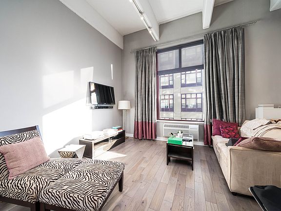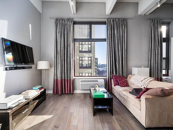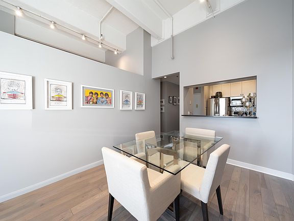 Welcome to this spacious, sun-drenched studio loft with soaring 14' ceilings and dramatic 10' picture windows offering a stunning Southern exposure. This thoughtfully designed space features a sleeping alcove, beautiful custom-built wall unit with a work space and added storage outfitted with specialty organizers and has been fully upgraded with new high-end wood flooring throughout. Custom room-darkening shades and blackout curtains ensure privacy and comfort at any time of day. The open-concept kitchen boasts a beautiful mosaic glass tile backsplash, upgraded cabinets with sleek matte black hardware, and high-end stainless steel appliances. The layout flows seamlessly into dedicated dining and living areas, perfect for both relaxation and entertaining. The bathroom, finished with classic black and white tiles, offers plenty of space for additional storage and the convenience of in-unit laundry. Parking is available through the landlord for a discounted rate. Enjoy the luxe amenities of Hudson Tea, offering a full suite of services including a 24-hour concierge, nearly 3000 sqft gym with Pelotons and included fitness classes, stunning resident's lounge with private dining room w/NYC views, a new free WFH space, new kid's playroom, 3 high-speed elevators, free shuttle to/from PATH, dry cleaner, Choc O Pain French cafe onsite, and resident's courtyard with fire pit perfect for alfresco dining. Additional amenities include bike & add'l on site resident's storage. Located directly on the Uptown Hudson River waterfront, enjoy proximity to neighboring Harborside & Maxwell Parks, boutique shopping, outdoor eateries, Soul Cycle, Pilates, spas, Cork Wine shop, and easy access to transportation including the Direct 14th St Ferry to Midtown & WFC. With Trader Joe's, Whole Foods, farmer's market, and Urban Market groceries coming soon, every convenience is at your doorstep.