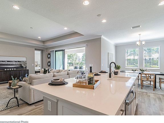 The large breakfast café sits facing the rear of the home for peaceful views during mealtimes, while large sliding glass doors from the great room open to an extended covered lanai for the ultimate entertaining setup. Plumbing and electrical wiring for an outdoor kitchen and an in-ground pool and spa pre-wire are already in place for future home improvements.