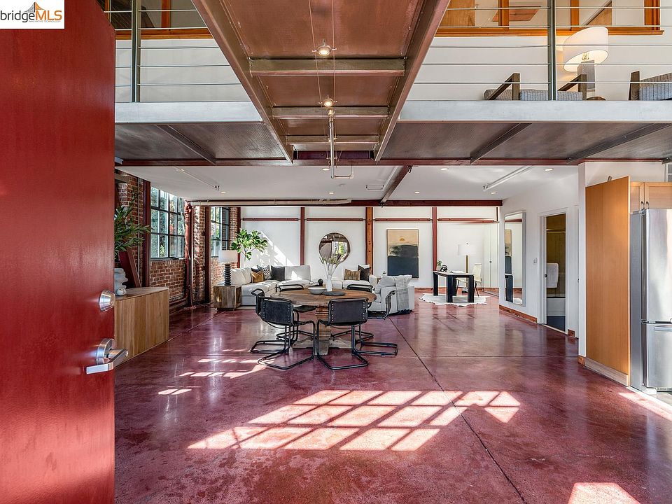 A Slice of Soho! A must see for creatives, artists, and entrepreneurs! This large, open-plan two-story loft style condo is a wonderful oasis and an exciting environment in which to live. Known as the International Lofts, the units in this enclave have an incredibly versatile floor plan. This corner unit benefits from walls of windows and an expansive great room on ground level that offers tremendous flexibility for living. The modern kitchen features ample cabinet space, a combination of light wood cabinets, stainless steel drawers, glowing floor tiles and copper elements. The first floor has a full bath & abundant storage. This main living space looks onto a communal landscaped garden. A beautifully designed perforated steel staircase ascends to a long, breezy mezzanine space that has served the current owners as additional office space. Adjacent are two bedrooms, each with access to their own private bathroom, one full & one half-bath. Slanted skylights throughout the spaces, vaulted ceilings & south-facing windows flood the condo with light and create a bright, airy abode: wood beams, steel trusses, concrete floors and copper baseboards provide aesthetic enhancements. Bordering the vibrant Fruitvale Commercial District, close to shopping, dining, + BART.