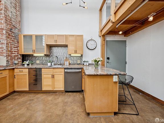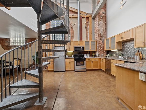 Calling Visionaries, Creators, and Entrepreneurs! Get ready to be captivated by this sprawling, two-story loft-style condo embodying urban energy. Nestled in the prestigious International Lofts complex, this unit offers versatile design for your lifestyle. The ground-level great room is bathed in light from skylights and glass-block windows. Whether craving a cozy retreat or modern setup, this space is your canvas. The kitchen blends wood cabinets, steel drawers, and copper accents, achieving harmony. Completing this level, a full bath and ample storage provide convenience. A graceful spiral staircase leads to the loft bedroom and mezzanine, perfect as a home office. Adjacent is a tranquil bedroom haven with ensuite bathroom, meticulously designed for relaxation. Sun-kissed skylights add radiance, while interplay of vaulted ceilings, wooden beams, steel trusses, concrete floors, and copper baseboards exudes industrial charm. Situated at edge of vibrant Fruitvale Commercial District, this residence invites indulgence in shopping, dining, and BART access. Experience ingenuity and metropolitan living - your personal slice of Soho with parking and in-unit washer/dryer. Embrace the urban lifestyle, schedule a viewing today!