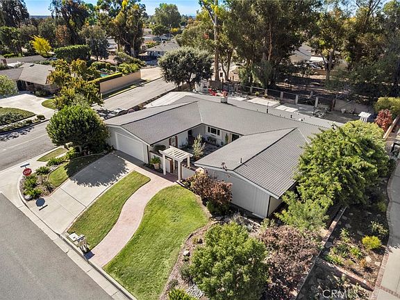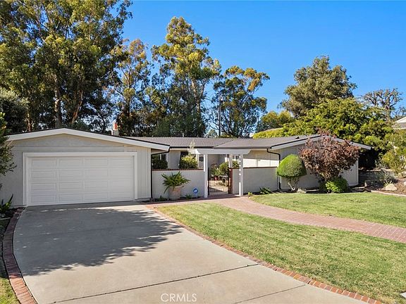 Situated on a spacious and beautifully positioned corner lot, 1501 Avolencia Drive, enjoys a tranquil location on the famed Fullerton Bridle Trail, with direct trail access from the backyard, you will find miles and miles of hiking, biking and equestrian trails quite literally on your doorstep. This mid-century inspired ranch style residence exudes an understated style and quality upgrades throughout. Step inside through a custom glass accented front door, an inviting and welcoming formal dining room features vaulted ceilings, brick fireplace and a custom wall of cabinets and shelving. French doors lead to the backyard as well. The great room and kitchen are really a special space with vaulted ceilings and an amazing wall of south facing windows and French doors that lead to an expansive red brick patio – ideal for outdoor entertaining. At the heart of the home is the chef quality kitchen with custom cabinetry, granite counters are accented by a stylish white subway tile and glass pendent lighting. A suite of GE s.s. appliances include dishwasher, fridge and built in oven and microwave. A 5 burner Dacor gas cooktop completes the kitchen. A remodeled powder room is found down the hallway with laundry closet. At the rear of the home two comfortably sized secondary bedrooms are found with vaulted ceilings and an upgraded ¾ jack n’ jill bathroom between them. One bedroom features custom built-ins creating great storage space and work area. Bedroom three features a custom built-in desk. The generously sized primary suite features vaulted ceilings and French doors that lead to the front courtyard. A walk in closet and updated en-suite bathroom complete the suite. A drought tolerant backyard offers so many options with amazing space and privacy with covered trellises along the west side of the home. Come and enjoy all that makes this coveted neighborhood so desirable – trails, schools, proximity to shopping, downtown Fullerton and St. Jude.