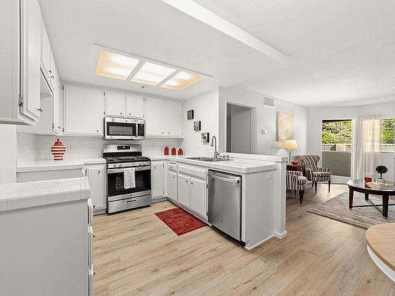 Ideally situated 55+ Hillcrest Senior condo enjoys a peaceful and quiet hillside location - Unit 111 is just a few steps from the elevator and features an ASSIGNED, GATED PARKING SPACE. A completely remodeled interior provide for a truly turnkey opportunity. Improvements in the last several weeks include; interior paint, luxury vinyl plank flooring THROUGHOUT the entire property, new S.S. appliances including a gas range and new kitchen faucet. BRAND NEW HVAC system, new blinds, a remodeled bathroom including stylish vanity and fixtures is spacious and has a convenient linen closet and hanging storage cabinet. The kitchen overlooks the dining area and welcoming living room with bay window and French door leading to a fully covered rear patio area. An extra storage closet is a convenient place to store extra items. The bedroom is comfortably sized and the closet features mirrored closet doors. Association amenities include; pool, spa, laundry, exercise equipment and a welcoming and spacious recreation room and kitchen facility including card tables, TVs and sitting area. Enjoy this great location across from Hillcrest park and a short walk from coffee shop and grocery store. Welcome home! Owner pays HOA dues which include water and trash.