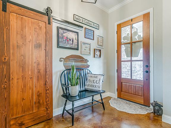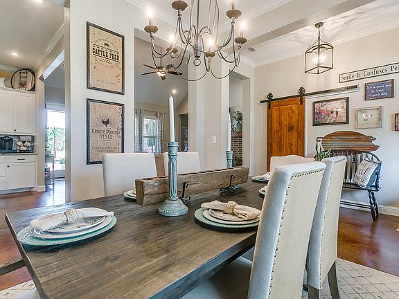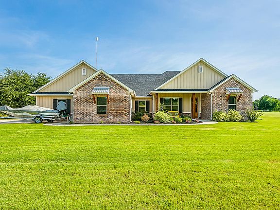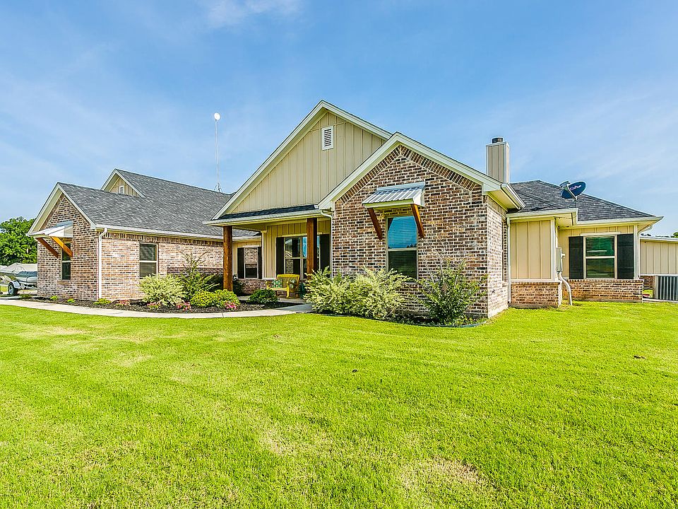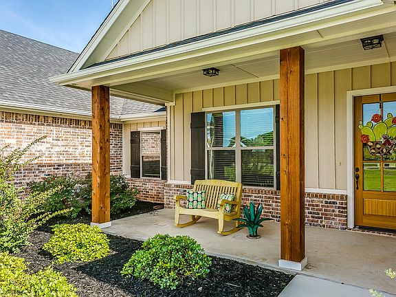 Stunning custom home on over 10 acres in Brock ISD!! Built in 2017, this open concept home features a large living room with a soaring vaulted ceiling that is open to a dream kitchen. Island is over 6 ft across! Split bedrooms make this a perfect home for a large family! Sit on your Texas sized back porch and watch the game or enjoy the view of the pool and the mature oak trees that run along the Kickapoo Creek. Separate pool house has full bath and second living area; perfect guest quarters! Barns on western end of property have water, electric and have been spray foamed. Pens have 5 lean to's and are fully fenced. Immaculate, one of a kind property with no restrictions!!