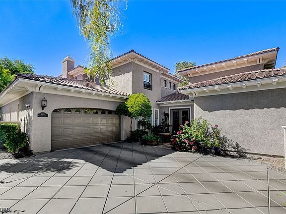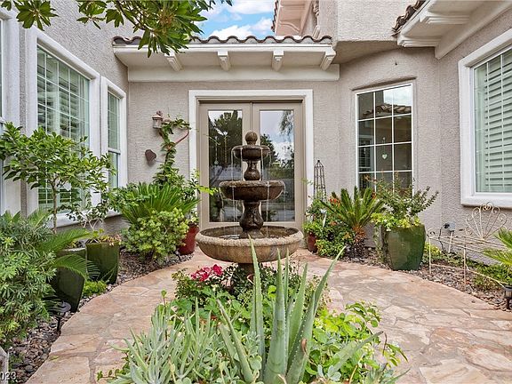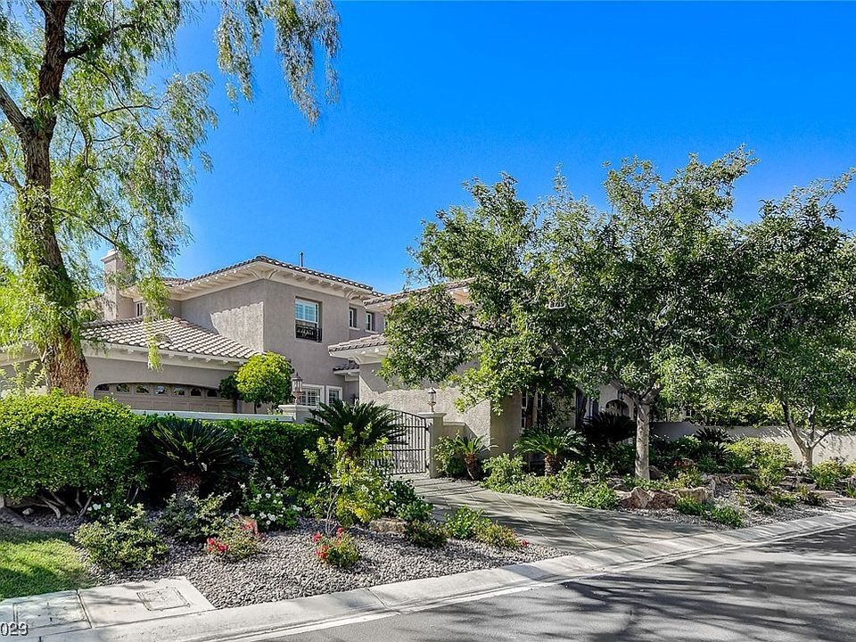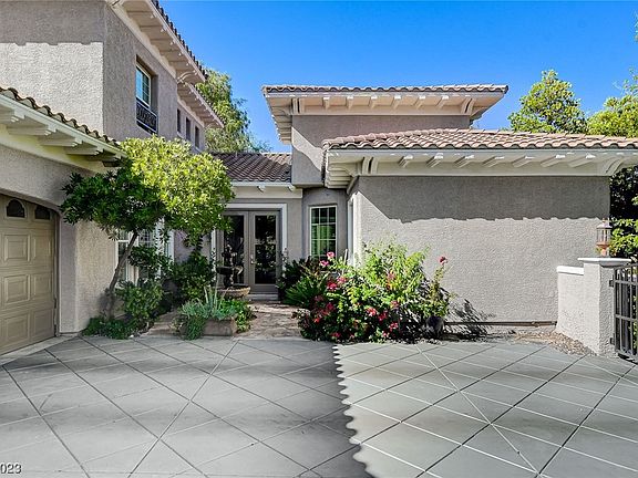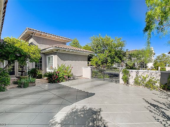 Sought-after guard-gated Vineyards community in Summerlin. Nearly 1/3 acre lot. Open chef's kitchen has stainless steel appliances (Viking refrigerator & La Cornue oven). Natural slate floor (look for the fossils!) flows well into the real hardwood oak. NEW: carpet, shutters, epoxy flooring in double garage. Front&back yards redone recently. Exterior repainted recently. Oversized primary bed is downstairs and has French doors out to the backyard. Heated pool with slide/waterfall/swim-up bar, spa, built-in BBQ, covered patio with fan, fire pit area, and more! Primary bath has NEW freestanding tub/sinks/shower/faucets. Separate space in front of the home has glass doors and would make a perfect office/library/den. Flex space in the rear has a sink, dishwasher, 2 wine fridges, pool bathroom with shower, plus double doors out to the back. 3 beds upstairs (1 with its own bath and 2 share a Jack-n-Jill). Gated driveway, 220 plug for EV, courtyard with fountain, two gas fireplaces.