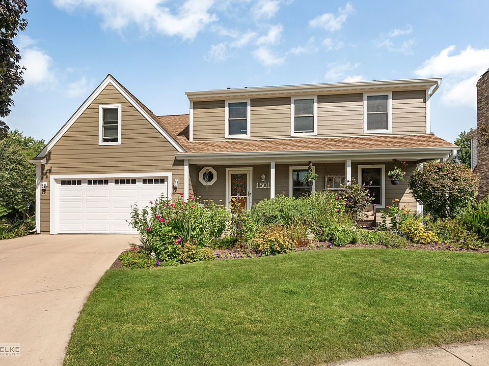 Vacation at your dream home with built-in pool, hot tub spa in coveted Naperville District 203. Tucked away at the end of a peaceful cul-de-sac, this beautifully updated and meticulously maintained home is just a short walk to Ranch View Elementary. Set on an oversized, professionally landscaped lot, it offers a true backyard retreat complete with a built-in pool, hot tub spa, automatic safety cover and lush outdoor living spaces with fully fenced yard - the perfect blend of luxury and relaxation. Exceptional curb appeal is highlighted by a completely renewed exterior, contemporary color scheme, and an inviting covered front porch. Step inside to a stunning remodeled kitchen featuring gleaming hardwood floors, custom 42" cabinetry with soft-close drawers and doors, granite countertops, stainless steel appliances, wine fridge, double oven, a tile backsplash, and a spacious island with seating for four. The kitchen flows seamlessly into a sunny dining area and an expansive family room highlighted by vaulted ceilings, recessed lighting, a masonry fireplace, built-in bookshelves and wall mounted TV which is included. A thoughtful home addition expanded the family room with continued vaulted ceilings and added a versatile office or fifth bedroom with vaulted ceilings, dual closets and tons of windows for maximum daylight. The main level also includes a spacious formal living and dining room with gleaming hardwood flooring, blinds, captures morning sun - ideal for entertaining and gatherings. Upstairs, the king-sized primary suite features a walk-in closet and a beautifully remodeled en suite bath with a dual-sink vanity and custom tiled bath/shower. All secondary bedrooms offer generous closet space and share an updated full bath with double vanities and tile work. The finished basement includes recessed lighting, drop ceiling, built-in storage nooks which provides flexible space for a recreation room, gym, and/or play area. The show stopping backyard is an entertainer's paradise: a spacious concrete patio, built-in pool with slide, relaxing hot tub spa , automatic pool/hot tub safety cover, trendy storage shed, and mature landscaping with flowering perennials and plenty of green space for play, play set, or additional seating. Major Updates include Premium LP SmartSide Siding, Facia, Gutters & Soffits (2024), Furnace (2022), A/C (2020), Roof (2018), Water Heater (2019), Radon Mitigation System (2019), Windows (2014), Sump Pumps (2022), Concrete Driveway (2015), Family Room/Office Addition (2000), Extra Attic Insulation (2019), New garage door and epoxy flooring (2024). With walkability to Ranch View Elementary and nearby parks, plus quick access to downtown Naperville, Metra, and major expressways, this home offers the perfect combination of comfort, convenience, and charm.