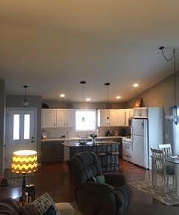 Cathedral ceilings with open floor plan that has a large granite island w/ hardwood floors in kitchen.